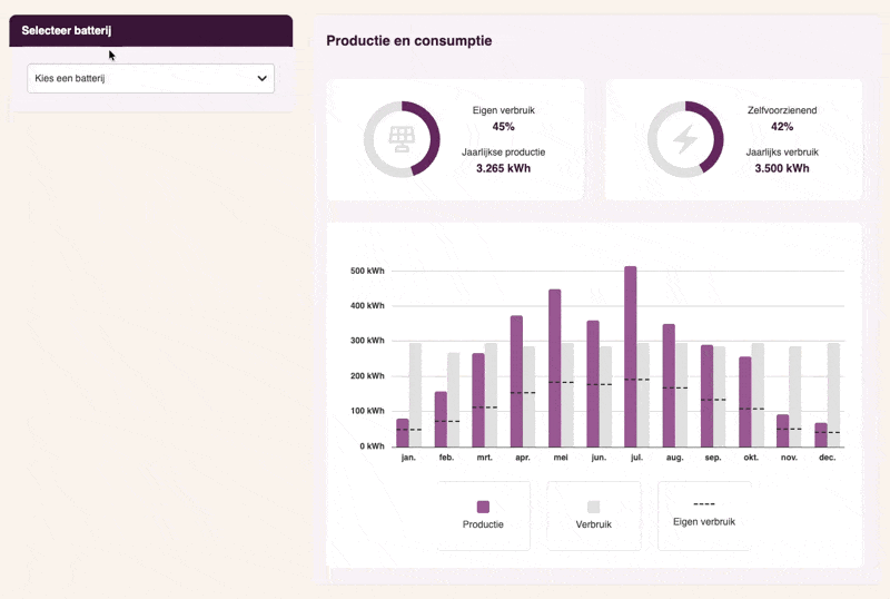Dankzij onze intuïtieve tool maakt u eenvoudig meerdere scenario’s met heldere grafieken over zelfconsumptie en terugverdientijd. Of het nu gaat om de efficiëntie van een warmtepomp of het potentieel van een batterij – u ontwerpt binnen enkele minuten een compleet en persoonlijk systeem dat precies laat zien waar de winst zit.