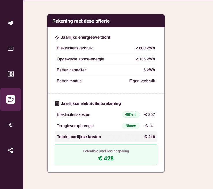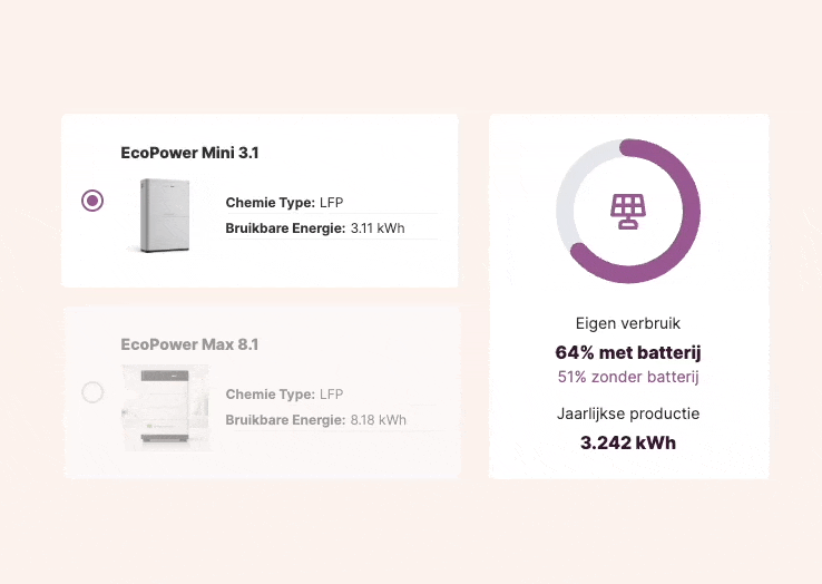 Voer klantgegevens in Bepaal gemakkelijk het huidige energiegebruik en eventueel de opbrengst van zonnepanelen. Dit helpt je om écht een batterij advies op maat uit te brengen.